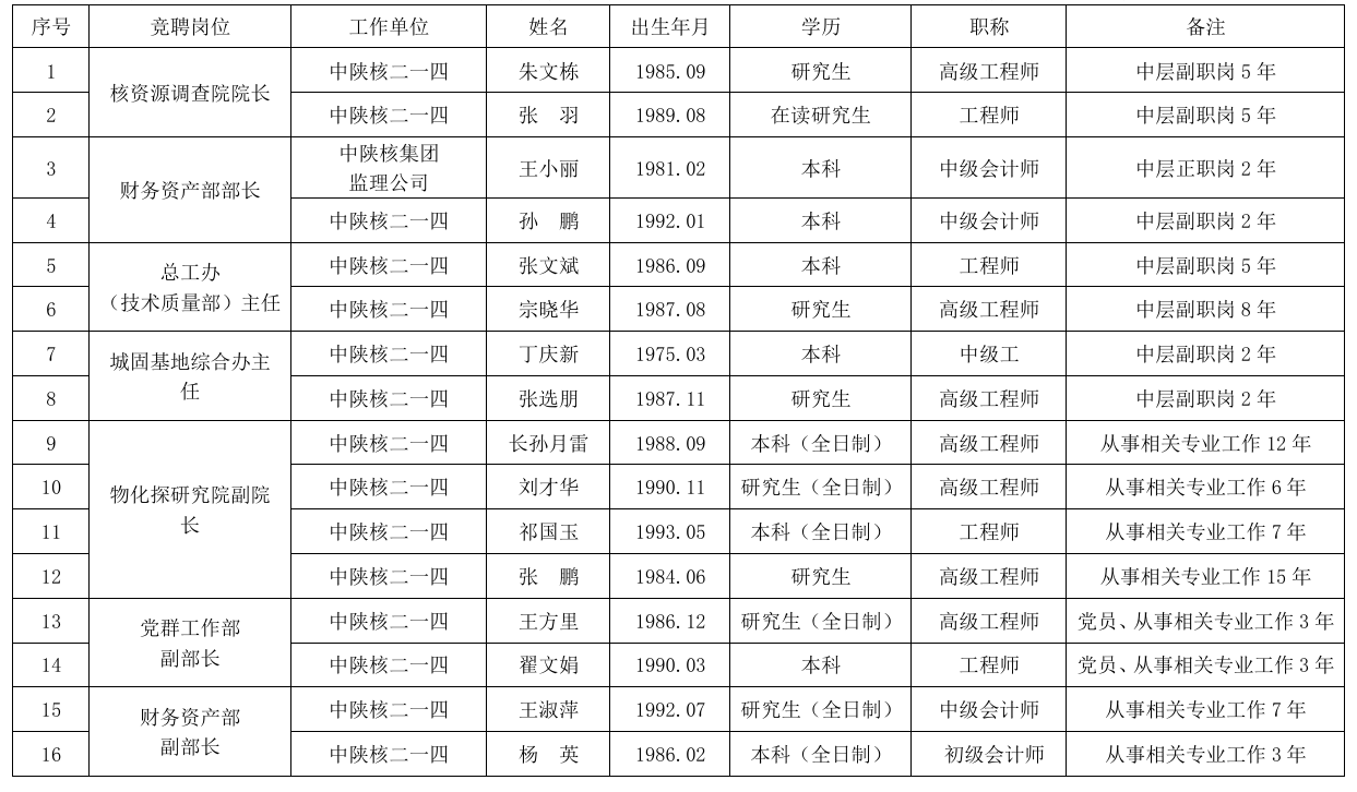根據中陜核工業集團二一四大隊有限公司《中層管理人員選聘工作方案》有關要求,現對資格審查通過的報名人員予以公示: