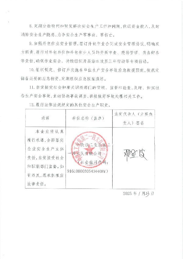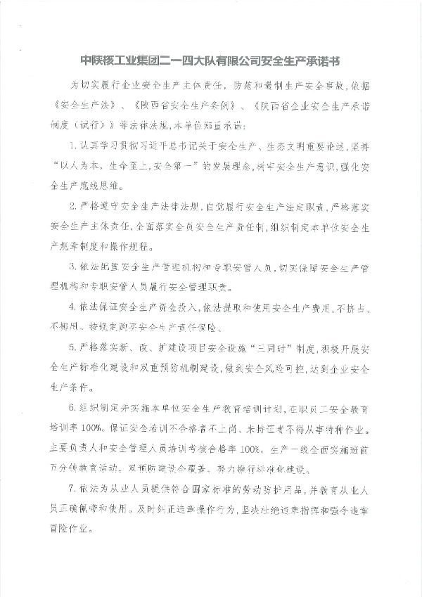 中陜核工業集團二一四大隊有限公司安全生產承諾書