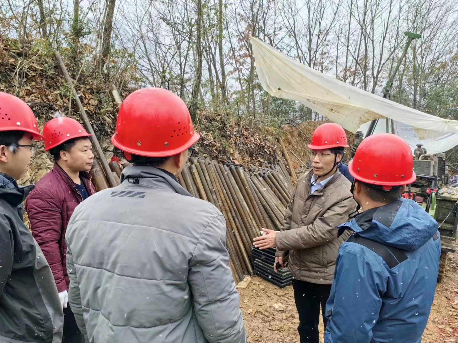 2月2日,公司黨委書記、董事長鄧盛波攜工會主席董興武、副總經(jīng)理、總工程師王朋深入野外一線到黃泥坪項目進行慰問并指導(dǎo)檢查工作,黨群工作部部長馮永強、總工辦主任宗曉華、地調(diào)院院長高政偉陪同,陜西省資深礦產(chǎn)勘查專家王民良受邀指導(dǎo)工作。