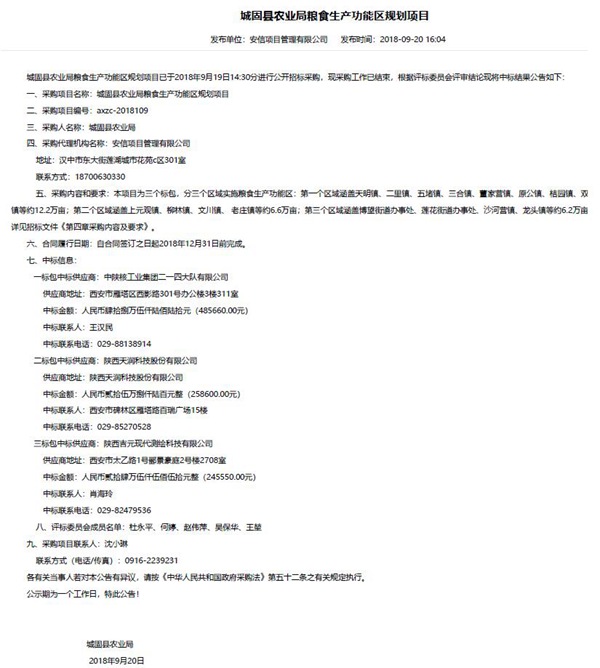 2018年9月20日,在城固縣農業局糧食生產功能區規劃項目進行公開招標采購中,公司憑借詳實完善的技術方案,成功中標“城固縣農業局糧食生產功能區規劃項目”。