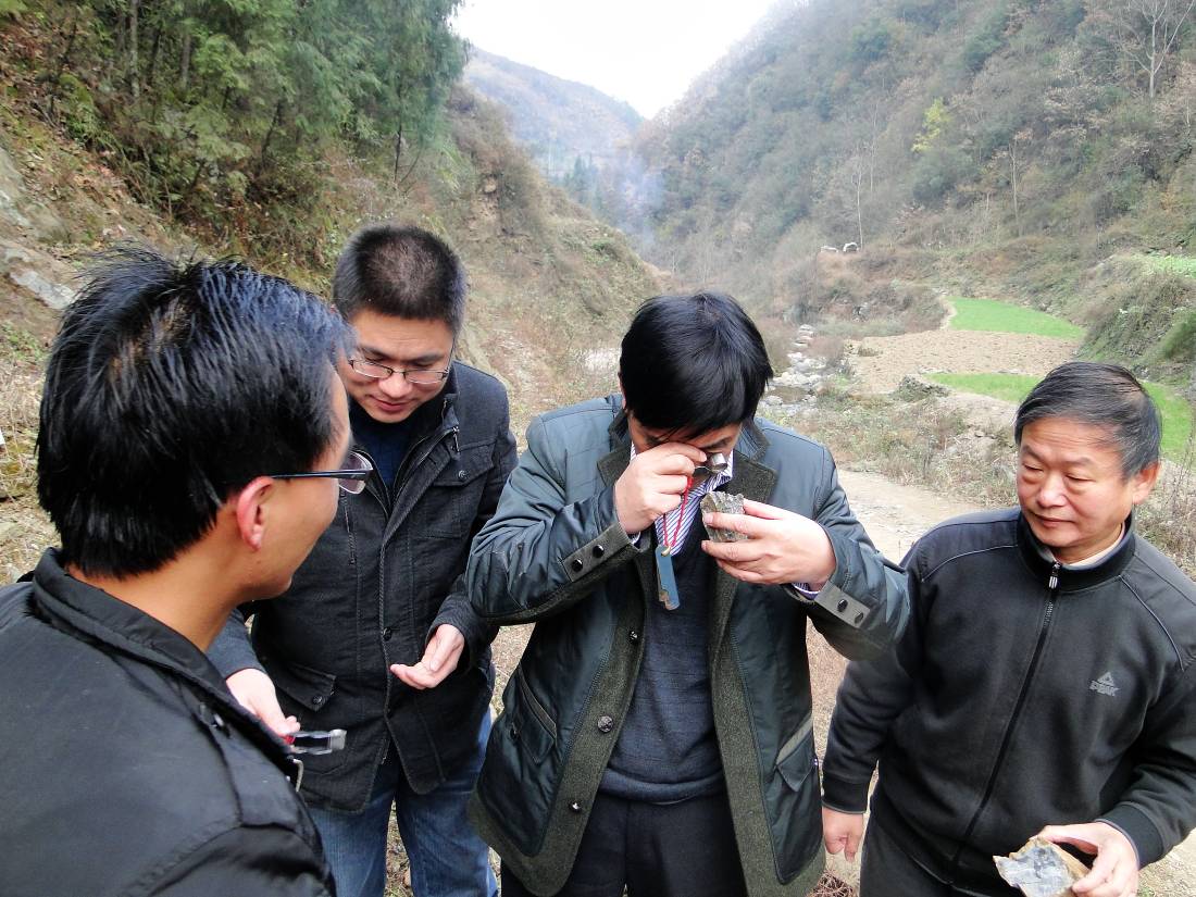 在黃泥坪金礦項(xiàng)目部,項(xiàng)目工作人員匯報(bào)了黃泥坪一期、二期工作情況,介紹了項(xiàng)目當(dāng)前所取得的成果、存在的問題以及下一步工作安排。隨后,劉總會(huì)一行來到某礦體露頭點(diǎn),實(shí)地查看巖礦標(biāo)本,與項(xiàng)目人員進(jìn)行現(xiàn)場(chǎng)交流。并沿著坎坷陡峭的山間小路跨過山谷,徒步深入鉆機(jī)施工現(xiàn)場(chǎng),查看巖心樣本,了解鉆探施工情況。