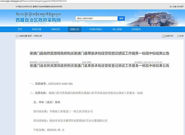 6月29日,公司成功中標西藏自治區謝通門縣草原承包經營權登記頒證一標段服務項目,中標金額363.35萬。
